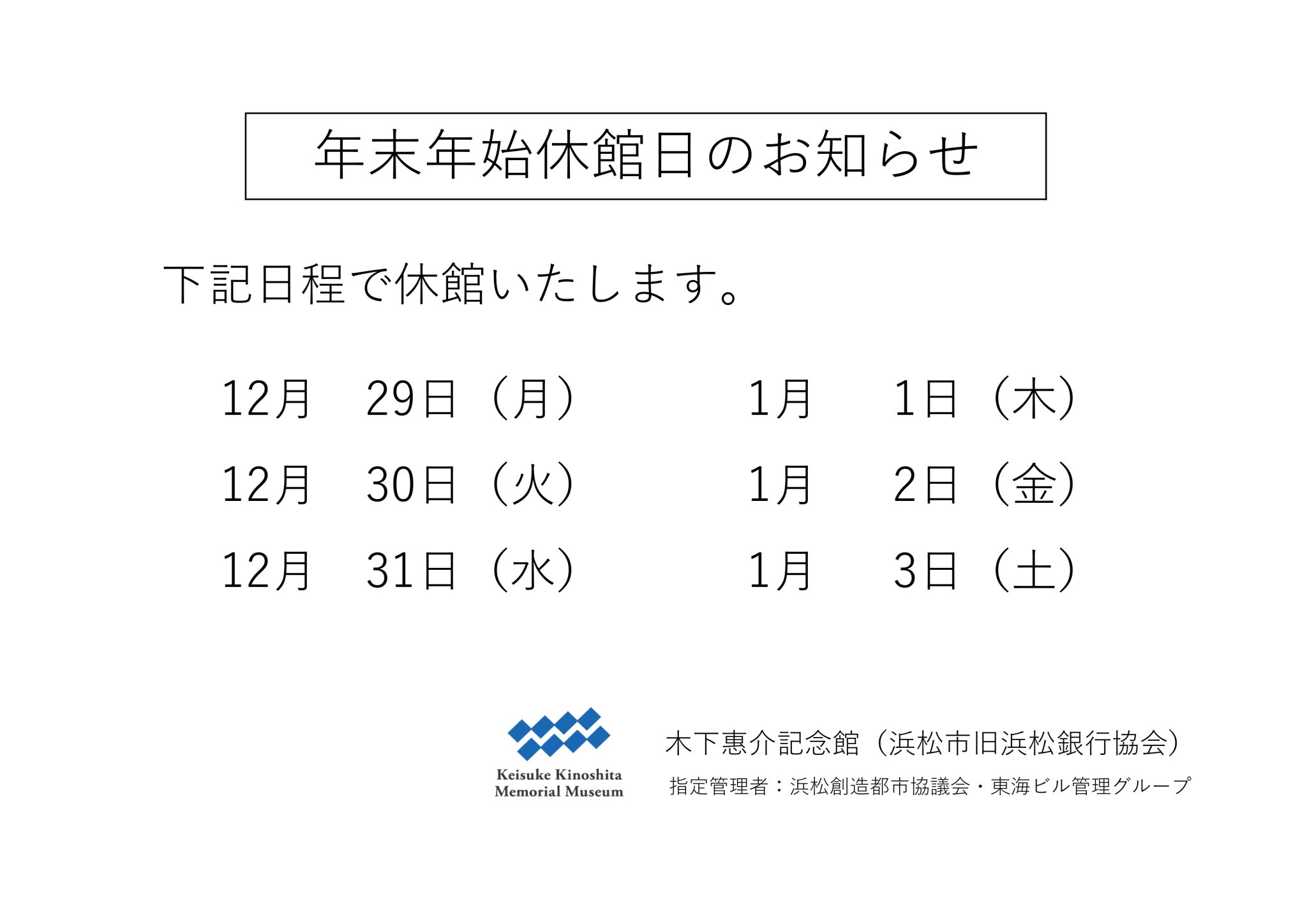 Topics POSTED on 2025.12.05 年末年始休館日のお知らせ年末年始休館日のお知らせです。 下記日程で休館いたします。ご参照の上、ご来館ください。 12月29日(月)12月30日(火)12 […] 年末年始休館日のお知らせの続きを読む