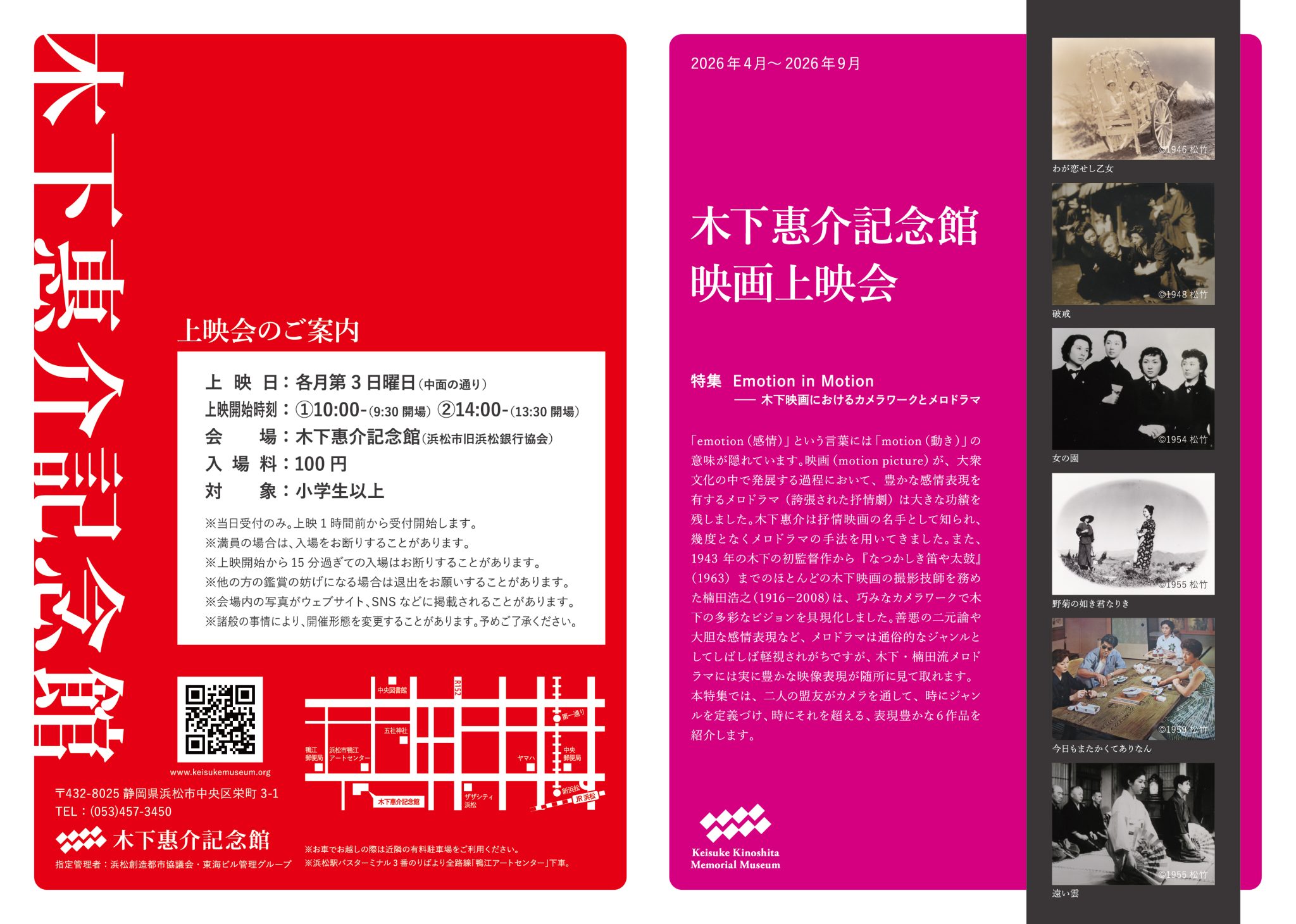 Event POSTED on 2026.02.03 木下惠介記念館映画上映会 2026年度上半期(2026/4~2026/9)上映特集「Emotion in Motion——木下映画におけるカメラワークとメロドラマ」特集「Emotion in Motion——木下映画におけるカメラワークとメロドラマ」 「emotion(感情)」という言葉のラ […] 木下惠介記念館映画上映会 2026年度上半期(2026/4~2026/9)上映特集「Emotion in Motion——木下映画におけるカメラワークとメロドラマ」の続きを読む