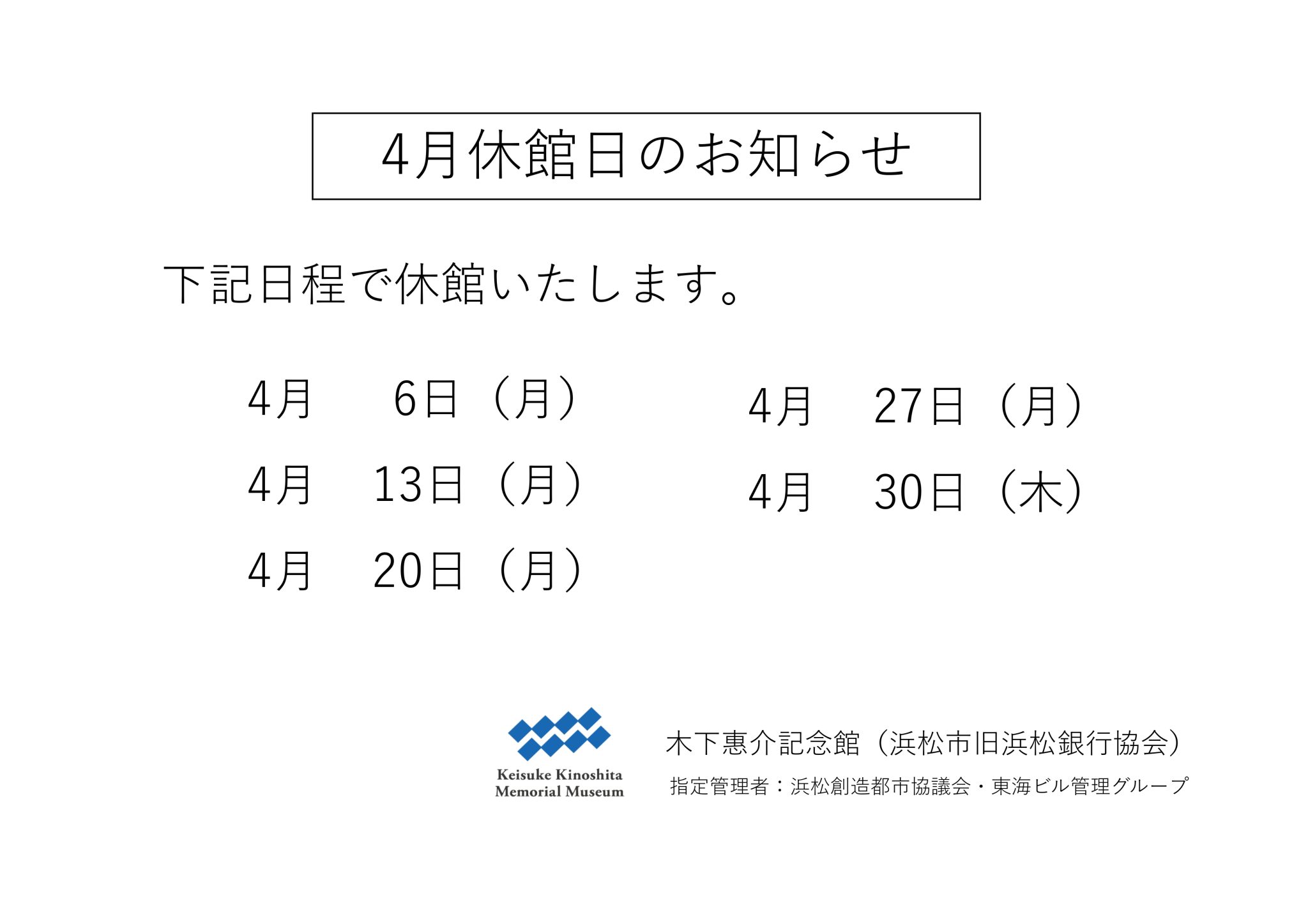2026年4月休館日のお知らせ